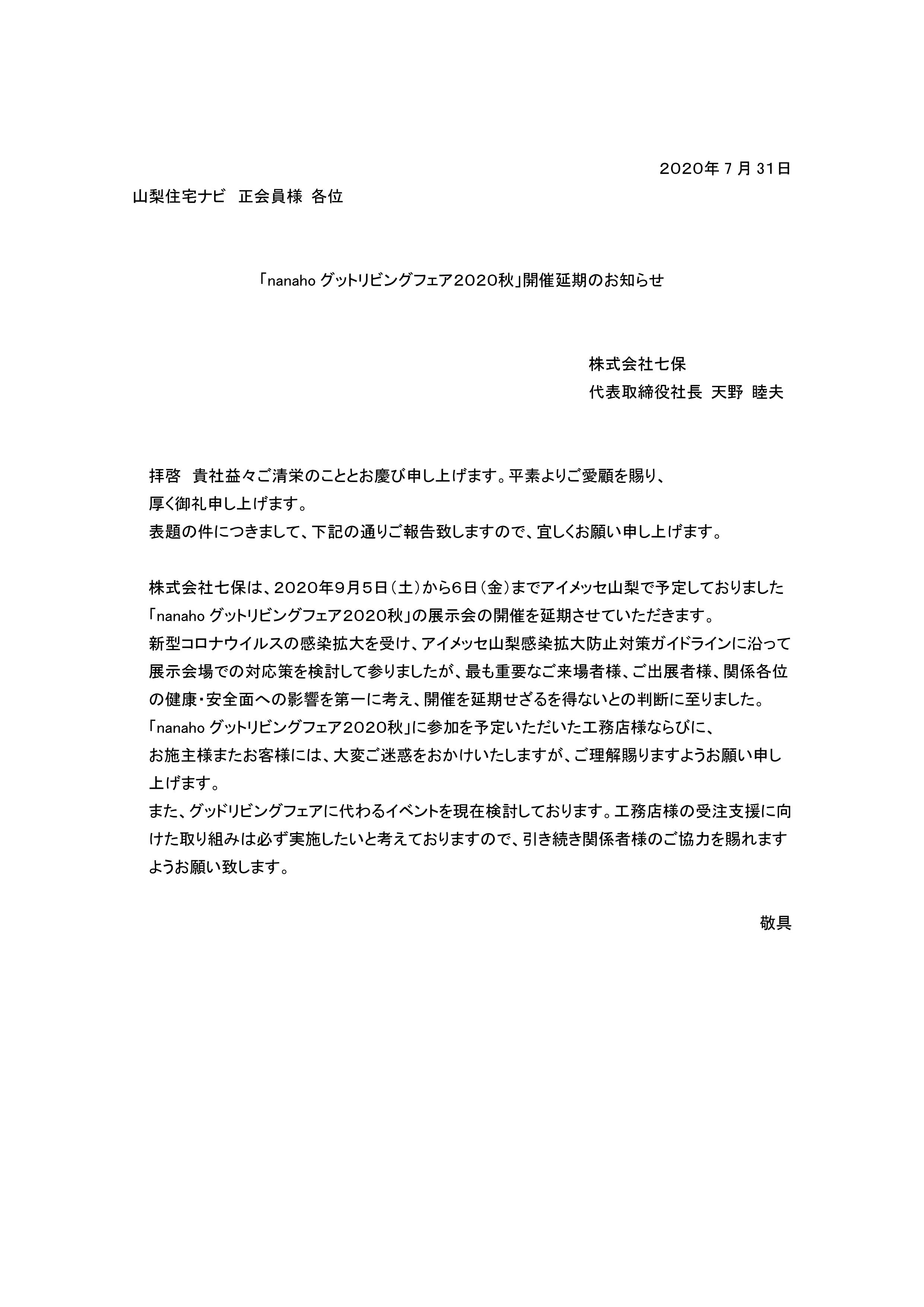 株式会社七保は、2020年9月5日(土)から6日(金)までアイメッセ山梨で予定しておりました「七保グットリビングフェア2020秋」の展示会及び関係セミナ-の開催を延期させていただきます。「七保グッドリビングフェア2020秋」にご参加を予定いただいた皆様には、大変ご迷惑をおかけいたしますが、ご理解賜りますようお願い申し上げます。