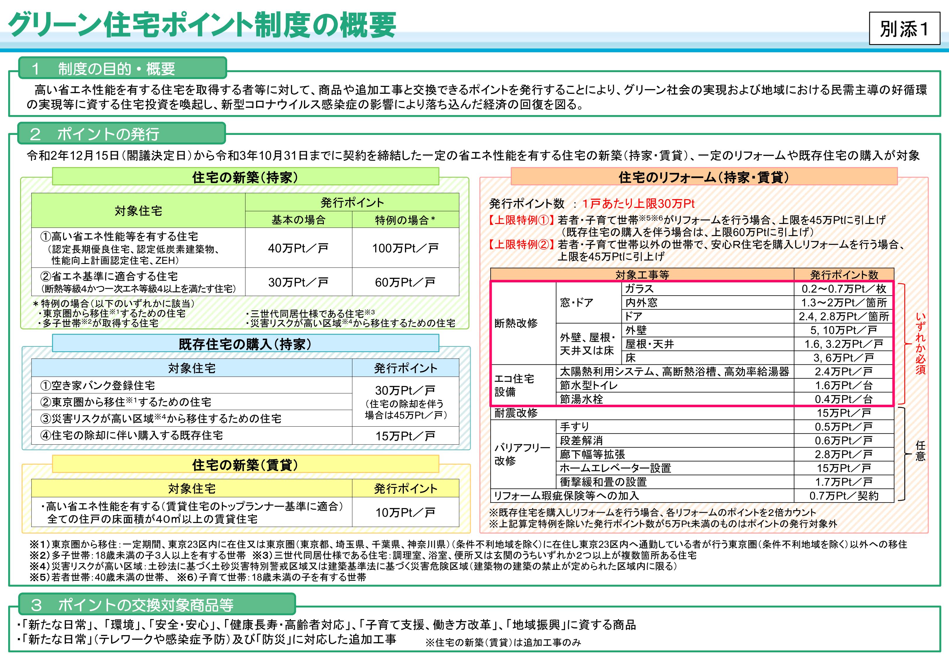 グリーン社会の実現および地域における民需主導の好循環の実現等に資する住宅投資の喚起を通じて、新型コロナウイルス感染症の影響により落ち込んだ経済の回復を図るため、一定の性能を有する住宅を取得する者等に対して、「新たな日常」及び「防災」に対応した追加工事や様々な商品と交換できるポイントを発行する制度です。